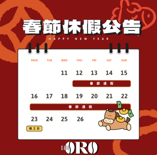 春節休假公告!HAPPY NERYEAR! 春節休假及出貨公告 為了讓團隊整備能量,以提供更優質的選豆服務, 歐若國際將於春節期間調整營運時間: ▶暫停服務: 2月12日(週四) 至 2月22日(週日) ▶正式開工: 2月23日(週一) 起恢復正常出貨與諮詢