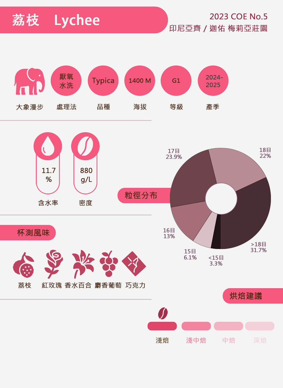 採完熟咖啡果實並去除果皮及部分果膠,緊接著活化特殊酵母菌種後加入氣密桶進行厭氧發酵72小時,至發酵完成再將生豆移至曬場乾燥8~12小時,讓生豆乾燥、硬化並去除完羊皮層(Parchment)後,再次加入原發酵液以GrainPro包裝進而避光厭氧8~12小時後取出至曬場乾燥至含水量低於12%。