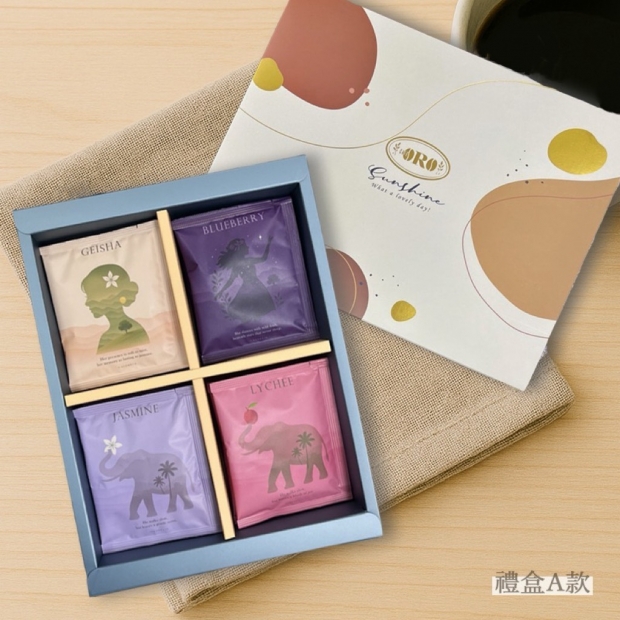 »禮盒內容物 藝妓*5入 烘焙度:淺焙 風味敘述:龍眼蜜、甜橙、楓糖、紅茶。 容量:11g 大象漫步-藍莓風味*5入 烘焙度:淺焙 風味敘述:葡萄、藍莓、莓果類、蜜糖、香辛料、綠茶。 容量:11g 大象漫步-荔枝風味*5入 烘焙度:淺焙 風味敘述:荔枝、紅玫瑰、萬壽菊、香水百合、麝香葡萄、巧克力。 容量:11g 大象漫步-茉莉風味*5入 烘焙度:淺焙 風味敘述:茉莉花、澄花、咖啡花、綠茶、香辛料。 容量:11g