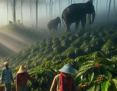 就在這樣的時刻,當地的採收農民偶爾會停下手中的工作。他們望向濃霧深處——那裡,傳來低沈的腳步聲,樹叢微微搖動。一隻或數隻野生蘇門答臘象,悄悄穿行於莊園邊界,牠們巨大卻溫和的身影在霧中忽隱忽現,像漂浮一般地移動。